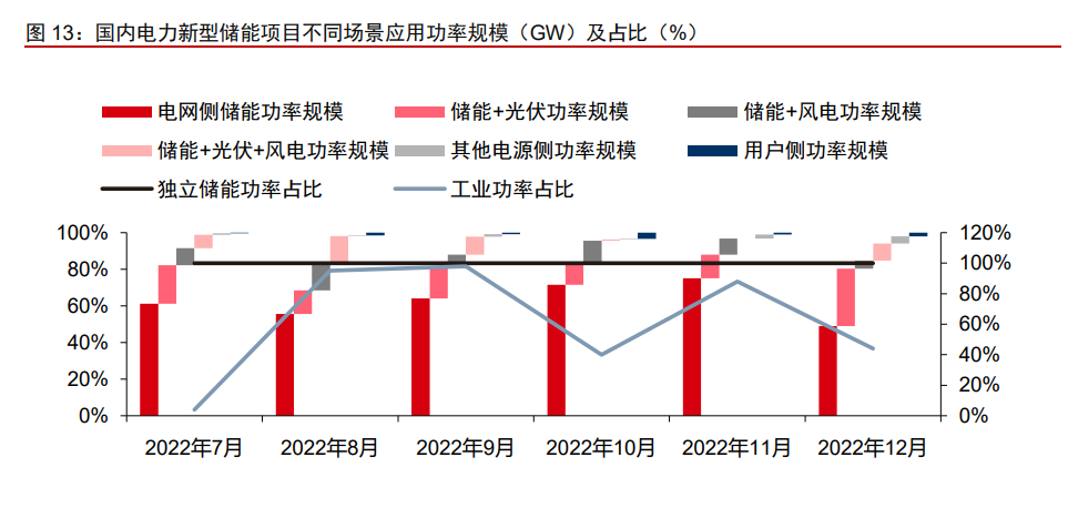 其三,電網(wǎng)側(cè)獨(dú)立儲(chǔ)能與電源配儲(chǔ)為主,用戶側(cè)工商業(yè)占比逐漸提升。從應(yīng)用場景來 看,新型儲(chǔ)能項(xiàng)目主要集中于電網(wǎng)側(cè)(100%為獨(dú)立儲(chǔ)能)與電源側(cè)配儲(chǔ)(95%為新能源 配儲(chǔ))。用戶側(cè)儲(chǔ)能項(xiàng)目功率規(guī)模占比仍較低,但其中工業(yè)項(xiàng)目占比逐步穩(wěn)定在 50%以上。