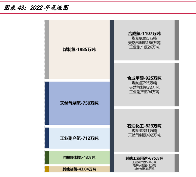 當前國內氫能大部分應用于工業領域,包括合成氨、合成甲醇及石油化工。隨著 長期碳中和目標的提出,氫氣的能源屬性將逐漸顯現,應用領域將逐步拓展至電力、 交通、建筑等場景。以中國 2022 年氫產能下游應用為例,其中合成氨氫氣需求 1107 萬噸,占 31.1%。合成氨作為化肥和其他化工產品的重要原材料,60%用于農業化肥生 產,30%用于工業生產,而交通部門(船舶運輸)和發電部門(摻氨燃燒)占比很低。 合成甲醇氫氣需求 925 萬噸,占 26.2%。合成甲醇大部分用于化工合成,主要合成 產品為烯烴、甲醛、醋酸、MTBE 以及二甲醛等。石油煉化氫氣需求 823 萬噸, 占 23.3%。 未來,氫氣因其熱值高,質量能量密度大的特點或將被廣泛應用于交通領域,氫 燃料電池汽車比傳統的純電動車具備更長的續航能力。2022 年我國氫燃料電池車累 計銷量 12682 輛,加氫站累計建成 274 座,依據中國國家發展和改革委員會發布《氫 能產業發展長期規劃(2021-2035)》提出,到 2025 年燃料電池車輛保有量約為 5 萬 輛。同時,因氫氣單位質量的熱值遠大于天然氣,能夠更好地滿足建筑供熱需求而應 用于建筑發電等其他領域。