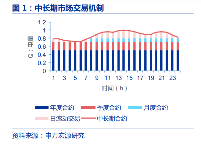 如果把上述五個方向繼續向下展開,涉及到的品種多達十幾種,紛繁復雜的電力交易 品種以及各不相同的機制提高了對電力市場研究的門檻。但從電力系統運行的本質來說, 不論是電能量市場、輔助服務市場還是容量電價,大體上都是要實現兩個功能:有功平衡 和無功平衡。 有功平衡即電力系統需要保持發電功率和用電負荷時時刻刻相等。為了保證供電的可 靠性以及用電成本的穩定性,用戶側需要提前安排和預測其未來的用電需求,發電側需要提前預測其未來出力情況(風電、光伏、水電等)或安排發電計劃(化石能源),因此需 要提前簽訂用電合約來使供需平衡。但不論新能源的出力還是用電計劃,距離用電時間越 遠把握性越小,所以根據簽訂合約時點與實際用電時點的遠近,可以分為中長期和現貨交 易,本質目的是對電力合約進行分解,使得電力合約與實際用電需求盡量匹配。 中長期交易從時間尺度上可以分為年度合約、季度合約、月度合約等,現貨交易則主 要分為日前、日內和實時現貨交易。將電能量市場根據時間尺度不同分解為不同的產品, 本質上是在市場靈活性和交易成本之間取平衡,時間尺度越長靈活性越差,交易成本越低, 反之則靈活性越強但交易成本越高。