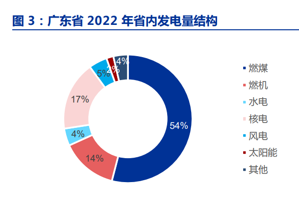 2022年是1439號文發布后電力市場運行的第一個完整年,以廣東省為例,廣東省 2022 年累計發受電量 7616 億千瓦時,其中外省送電 1772 億千瓦時,本地電源發電量 5844 億 千瓦時,從交易電量來看,2022 年廣東省總共完成交易電量 5309 億元,占本省機組發電 量的比例超過 90%,其中直接交易電量 2986 億千瓦時,占本身機組發電量比例為 51%。 在直接交易電量中,中長期電量 2871 億千瓦時,占比 96%,其中年度交易 2662 億千瓦時, 月度交易 223 億千瓦時,其余為周交易以及多日交易等。現貨偏差電量 100 億千瓦時,但 發電側日前總成交電量達到了 3800 億千瓦時。 2022 年廣東省內機組煤電、氣電、水電、核電、風電和太陽能發電量分別為 3157、 829、254、1019、270、103 億千瓦時,煤電占比為 54%。但在電力市場中,煤電是絕對 主力,中長期市場交易電量 2871 億千瓦時中煤電、氣電、核電占比分別為 74.8%、20% 和 5.2%。