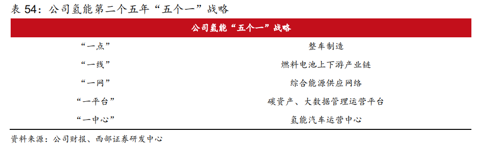 率先布局氫能全產業鏈,全面啟動“五個一”戰略。公司于 2017 年在氫能產業鏈領先廣 泛布局,至 2021 年完成氫能發展的第一個五年規劃,目前已經搭建了上游氫氣的“制-儲運-加”氫能供應體系、中游“膜電極-燃料電池電堆及系統-整車制造”核心裝備產業鏈,以及 下游六大區域氫能示范應用的三 維格局,形成從研發—生產制造—商業化應用的“氫能源 全生命周期”創新生態鏈。2022 年,公司啟動氫能產業第二個五年計劃,確立“五個一”戰 略。