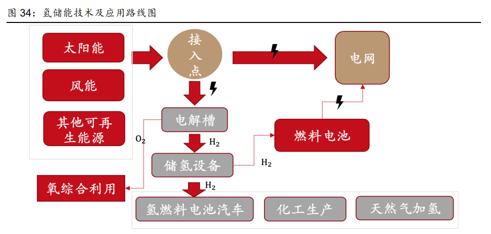 與其他儲能方式相比,氫能更能滿足大規模、長時間消納需求。與抽水儲能、鋰電池儲能 等方式相比,其具有邊際成本低、能量密度大、無自衰減等優勢,能夠實現跨周、跨季儲 能。但其實際應用需要經過光伏發電到制氫再由儲氫發電的兩次轉換,短期內儲能效率較 低。鋰電儲能的效率更高,適用于日度調峰;氫能更針對于大規模儲能和季度調峰,擴容 只需要增加儲氫設備,邊際成本更低。