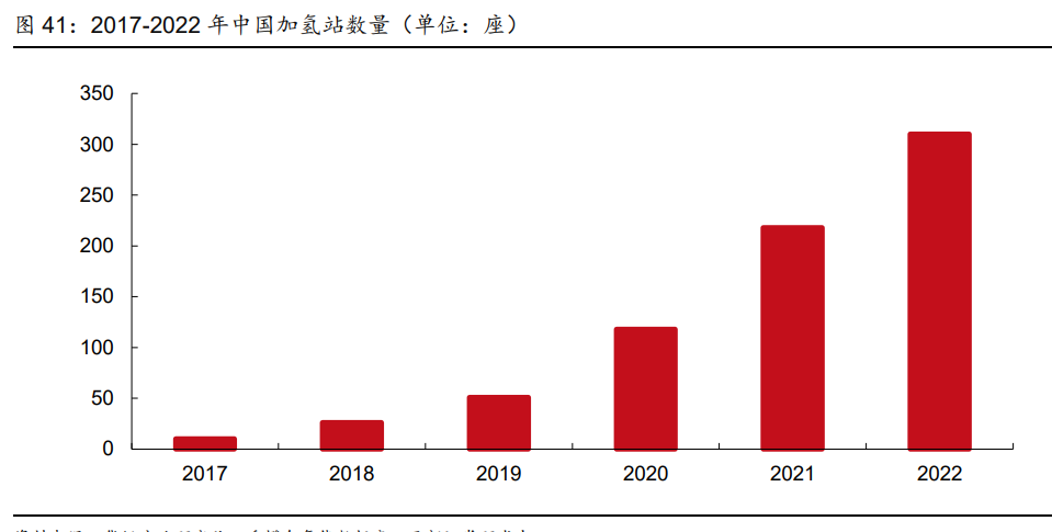 加氫站布局加快,逐漸形成網絡。加氫站等基礎設施是否完善是影響消費者購買氫燃料電 池汽車熱情的主要因素。隨著國內氫燃料電池汽車累計銷量增加,中石化、中石油等能源 央企不斷加大加氫基礎設施的投資和建設力度,國內加氫站數量呈現快速增長趨勢。截至 2022 年底,我國加氫站累計建成數量達到 274 座。根據 2020 年中國汽車工程學會發布 的《節能與新能源汽車技術路線圖 2.0》相關規劃,到 2035 年加氫站的建設目標為至少 5000 座,中國未來加氫基礎設施的市場規模在 2030-2050 年將突破千億。此外,我國加 氫站建設參與主體呈現多樣化趨勢,采取規模化建設或加油/加氫/加氣站合建等方式來拓 展加氫基礎設施網絡,單位加注成本也有望下降。