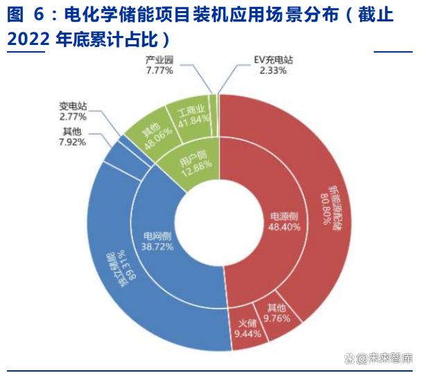 從應用場景看,2022 年儲能應用場景仍以新能源配儲及電網側獨立儲能為主。根據 中電聯統計口徑,截至 2022 年底,已投運的電化學儲能電站累計裝機主要分布在電源側, 占比達 48.4%,其次為電網側 38.72%和用戶側 12.88%。2022 年各應用場景新增裝機占 比基本保持不變,電源側占比 49.24%,其次為電網側 43.13%和用戶側 7.63%。從具體 場景看,新能源配儲為電源側主要場景,獨立儲能為電網側主要場景。