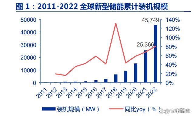 2022 年中國累計新型儲能裝機 13.1GW/27.1GWh。根據中關村儲能產業技術聯盟 (CNESA)截至 2022 年底數據,全球已投運電力儲能項目累計裝機規模 237.2GW。其 中,新型儲能累計裝機規模達 45.7GW,同比增長率達 80%。中國已投運電力儲能項目裝 機規模 59.8GW。其中,新型儲能累計裝機規模達 13.1GW/27.1GWh,功率規模同比增 長 128%,能量規模同比增長 141%。 2022 年中國新增新型儲能裝機 7.3GW/15.9GWh,居世界第一。2022 年中國新增 投運電力儲能項目達 16.5GW。其中,新增新型儲能裝機 7.3GW/15.9GWh,功率規模同 比增長 200%,能量規模同比增長 280%。從地區看,中國是 2022 年全球新型儲能項目 新增占比最大的市場,占比高達 36%。
