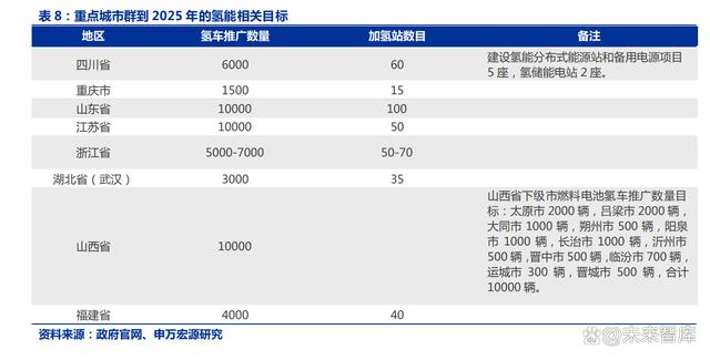 川渝、山東、浙江、湖北、山西等各大重點城市群在積極布局氫能發展戰略,提出到2025年,氫車推廣計劃總數超四萬輛,加氫站建設計劃總數達到260座。其中,各大重點城市群將依據自身的資源和稟賦來發展氫能產業鏈,山西、山東、江蘇省到2025年的氫車推廣數量達到萬輛級別,山東省加氫站數目率先上百,同時,山東和山西推出氫能高速網絡的建設。