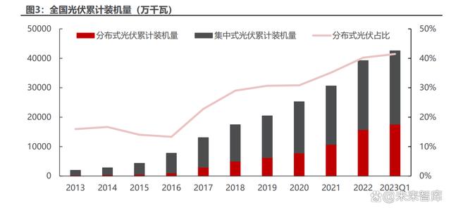 我國分布式光伏累計裝機占比逐漸提升。相比于集中式光伏,分布式光伏規模 較小、輸出電壓功率較小且更接近用戶側,具有投資小、建設快、占地面積小等優 勢。截至 2022 年底,中國光伏累計裝機量達 392GW,其中分布式光伏累計裝機 量達 158GW,占比 40%。