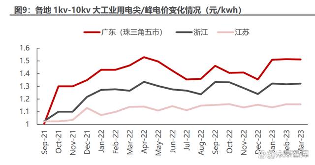 “分時電價”、“電力市場化”政策驅動,大工業平均用電價格提高。2021 年 下半年全國大部分省份陸續出臺分時電價政策,調整峰谷電價及峰谷時段,其中以 江蘇、廣東、浙江為例的經濟發達省份率先、多次調整,峰谷價差有較大幅度的擴 大,尖、峰時段也有不同程度的延長,大工業平均用電價格提高。