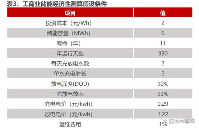 工商業儲能經濟性測算假設條件:1)項目案例:浙江 3MW/6.88MWh 用戶 側儲能系統項目,假設工廠白天負荷穩定可完全消納儲能放電,且變壓器容量滿足 儲能充電需求;2)項目成本拆分:我們假設工商業儲能項目整體投資成本為 2 元 /Wh,其中電池占比 55%,集裝箱占比 15%,BMS 占比 7%;3)運行模式:考 慮工廠休息及設備檢修,儲能設備每年運行 330 天,每天進行兩次充放電。第一 次在夜間谷價充電,在上午尖峰電價放電 2 小時;第二次在午間谷價充電 2 小時, 在下午尖峰電機放電 2 小時;4)峰谷價差:參考浙江工商業峰谷電價,假設尖峰 電價 1.22 元/KWh,低谷電價 0.29 元/KWh,峰谷價差為 0.93 元/KWh。