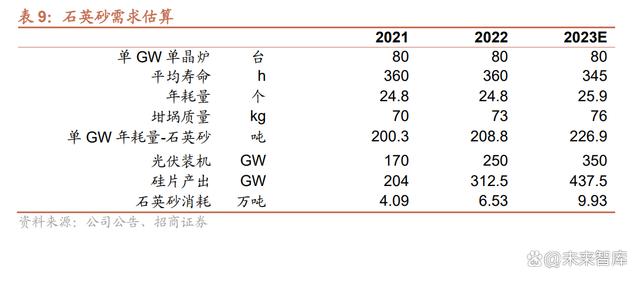 石英坩堝是硅片生產過程中的消材,目前尚無替代品。石英坩堝主要應用于光伏 及半導體領域的拉晶環節,是硅片生產流程中的關鍵材料。在硅棒拉制過程中, 石英坩堝逐步向方石英轉化,一定時間后無法使用,需要更換新的石英坩堝,在 硅片環節生產過程中具備較強的消耗品屬性。 石英坩堝原材料為高純石英砂,目前與高純石英砂比較相似的產品是合成石英砂, 但因成本及微量元素含量的限制,無法使用于光伏領域。 預計 2023 年石英砂供需偏緊。需求方面,預計 2023 年全球光伏裝機 350GW, 假設每100GW硅片的石英消耗為1.8-2萬噸,則石英砂需求預計9.3-10.3萬噸; 供給方面,尤尼明+TQC 合計 2.5-3 萬噸產能,石英股份 4.5-5 萬噸,其他產能 合計約為 1 萬噸,供給預計在 8-9 萬噸。 此外,2023 年海外石英砂占總產能比重約為 35%左右,整體看,行業內石英坩 堝使用壽命會下降,石英砂需求會進一步提升,2023 年石英供需緊張相對明確, 漲價時間及幅度可能會超預期。