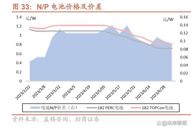 下游接受度躍升。經歷 1 年多的市場驗證,下游投資方對 N 型優勢理解更加深 刻。尤其是雙面率、衰減及溫度系數等優勢帶來的發電量增益,隨實際應用的實 證數據逐步體現,TOPCon 已得到行業性的認可。近期部分招標項目 N 型份額 已由此前 10%上下提升至近 50%。2021 年 PERC 市占率約 91%,2022 年降至 88%,而 N 型份額由 2021 年 3%提升至 9%,N 型電池進入規模化應用階段。 溢價不斷放大。近期 N 型組件與 P 型組件的價差,已由 2 月的 0.05 元/W 逐步 攀升至 0.06-0.14 元/W(近期組件報價偏分散),整體溢價逐步放大,原因主要 系隨 N 型產品進一步降本增效、電站有效驗證的形成,TOPCon 優勢不斷驗證, 下游對 N 型組件的需求優先級更高,高效組件的議價能力更強。如果效率繼續提 升,溢價有望進一步放大。而 TOPCon 電池供應相對緊張,相較 PERC 溢價由 0.06 元/W 上下爬升至 0.1 元/W。