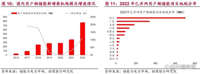 我國工商業(yè)用戶側(cè)儲(chǔ)能起步于 2016 年左右,早期主要依靠國家出臺(tái)的相關(guān)支持政策推動(dòng),隨著工商業(yè)儲(chǔ)能商業(yè)模式持續(xù)成熟清晰,工商業(yè)用戶側(cè)儲(chǔ)能新增裝機(jī)規(guī)模提速明顯。截至 2022 年,國內(nèi)用戶側(cè)儲(chǔ)能新增裝機(jī)規(guī)模達(dá) 764.73MW,同比增速超過 100%,其中工商業(yè)儲(chǔ)能占用戶側(cè)新增裝機(jī)規(guī)模的 80%-90%左右,并且主要集中在浙江、廣東、安徽、江蘇等地,對(duì)于國內(nèi)市場(chǎng)而言預(yù)計(jì)未來用戶側(cè)儲(chǔ)能將以工商業(yè)用戶為主,未來空間廣闊。