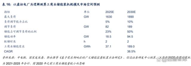 虛擬電廠帶來工商業儲能遠期需求超預期的可能。基于分布式光伏的裝機并估計儲能的滲透率,由于目 前量較小,滲透率較低,且工商業企業眾多,變化較大。能夠認為工商業儲能提供給用戶側充足的靈活 性資源,奠定虛擬電廠的發展基礎,而虛擬電廠的建設增添未來收益增長的預期,或將改變工商業儲能 的投資屬性,進而促進工商業儲能的發展,打開工商業儲能的遠期空間。這或將帶來下游企業的觀念的改變、儲能的剛需屬性凸顯,進而有望帶動儲能滲透率的快速提升。預計在虛擬電廠建設順利的情況下, 工商業儲能 2025、2030 累計裝機有望達 37GWh、189GWh。