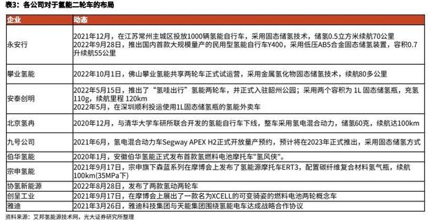 目前氫能二輪車布局主要來自于二輪車企業向氫能業務擴展。如永安行2B端推出Y200,2C端針對歐洲市場推出Y400。雅迪科技集團與天能集團圍繞氫能達成合作協議。