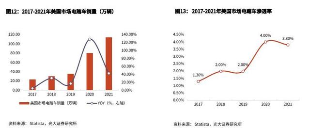 美國市場起步較晚,客戶群體主要為運動愛好者和極限發燒友。2020年以來,受疫情催化及政策推動,更多消費者選擇電踏車以滿足其通勤及休閑需求,客戶群體進一步擴大。2021年美國電踏車銷量114萬輛,同比增長40.7%,滲透率提升至3.8%。從美國政府提出的一系列稅收抵免、通勤津貼、關稅暫緩的政策,以及美國市場目前較低的滲透率來看,未來美國市場仍具有很大發展潛力。