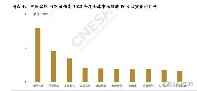 當(dāng)前儲(chǔ)能 PCS 生產(chǎn)廠(chǎng)商眾多,與光伏逆變器廠(chǎng)商高度重合。儲(chǔ)能變流器與光伏逆變器的最主要 作用都是實(shí)現(xiàn)交直流的轉(zhuǎn)換,所以?xún)煞N產(chǎn)品的主要零部件類(lèi)似,且在應(yīng)用端也開(kāi)始呈現(xiàn)高度的協(xié) 同效應(yīng)。在光伏 PCS 已經(jīng)取得非常大的市場(chǎng)規(guī)模的前提下,未來(lái)儲(chǔ)能 PCS 的競(jìng)爭(zhēng)格局與光伏逆 變器趨同,延續(xù)光伏 PCS 格局。當(dāng)前儲(chǔ)能 PCS 行業(yè)賽道參與者眾多,來(lái)自光伏逆變器、不間斷 電源(UPS)、充電樁(EV charger)、電網(wǎng)側(cè)-輸配電設(shè)備(PTD、MVD、APF、SVG)等多領(lǐng) 域廠(chǎng)商。據(jù) CNESA 數(shù)據(jù),2022 年度全球市場(chǎng)中儲(chǔ)能 PCS 出貨量排名前十位的中國(guó)儲(chǔ)能 PCS 提 供商,依次為陽(yáng)光電源、科華數(shù)能、上能電氣、古瑞瓦特、盛弘股份、南瑞繼保、固德威、索英 電氣、匯川技術(shù)和首航新能源。