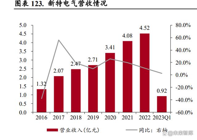 公司營(yíng)業(yè)收入快速增長(zhǎng),干式變壓器貢獻(xiàn)主要收入。公司客戶(hù)包括新能源、高端裝備、高效節(jié)能、 工業(yè)企業(yè)電氣配套、基礎(chǔ)設(shè)施、民用住宅、傳統(tǒng)發(fā)電與供電、新型基礎(chǔ)設(shè)施等領(lǐng)域,其中新能源的 營(yíng)收占比最高,是公司主要收入來(lái)源。受益于新能源領(lǐng)域的良好發(fā)展,公司營(yíng)業(yè)收入從 2017 年的 20.11 億元增加到 2022 年的 47.46 億元,CAGR 達(dá) 18.73%,2023 年一季度實(shí)現(xiàn)營(yíng)業(yè)收入 12.97 億元, 同比增長(zhǎng) 41.06%,繼續(xù)保持增長(zhǎng)態(tài)勢(shì)。分產(chǎn)品看,2017-2022 年干式變壓器系列收入占比 70%左右, 為公司主要的營(yíng)收來(lái)源,儲(chǔ)能業(yè)務(wù)和數(shù)字化整體解決方案業(yè)務(wù)起步,給公司帶來(lái)新的收入增長(zhǎng)點(diǎn)。