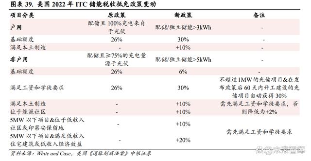 儲(chǔ)能稅收減免提升至以 30%為基礎(chǔ),經(jīng)濟(jì)性進(jìn)一步提升。 此前的 ITC 政策稅收抵免的基礎(chǔ)額度為 26%,現(xiàn)在在滿(mǎn)足工資和學(xué)徒要求后,基礎(chǔ)抵免可以達(dá)到 30%,另外,如果同時(shí)能夠滿(mǎn)足其他條件, 例如本土制作、位于能源社區(qū)等可進(jìn)一步提升抵免的額度,儲(chǔ)能電站的經(jīng)濟(jì)性得到進(jìn)一步提升。