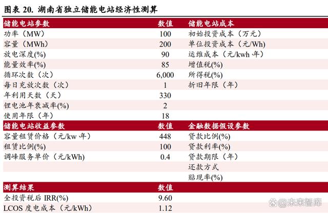 獨(dú)立儲(chǔ)能電站經(jīng)濟(jì)性可觀(guān)。我們以湖南省的實(shí)際情況為例,來(lái)測(cè)算獨(dú)立儲(chǔ)能電站的經(jīng)濟(jì)性,在目前 的各種條件下,湖南省獨(dú)立儲(chǔ)能電站的全投資稅后 IRR 達(dá)到 9.60%,具有客觀(guān)的收益性。 1)容量租賃收入假設(shè):參考湖南省的城步儒林 100MW/200MWh 儲(chǔ)能電站項(xiàng)目已經(jīng)簽訂的容量租賃 合同,湖南省的容量租賃價(jià)格為 448 元/kw*年。2)電力輔助服務(wù)收入假設(shè):電力輔助服務(wù)包括為電網(wǎng)公司提供調(diào)峰、調(diào)頻等服務(wù),按照每次調(diào)用規(guī) 模及調(diào)用次數(shù),電網(wǎng)公司給儲(chǔ)能電站支付費(fèi)用。 參考湖南省的現(xiàn)行 政 策以及城步儒林 100MW/200MWh 儲(chǔ)能電站項(xiàng)目的運(yùn)行情況,假設(shè)一年調(diào)用 330 天,每天一次充放,調(diào)用費(fèi)用為每 次 400 元/MWh。