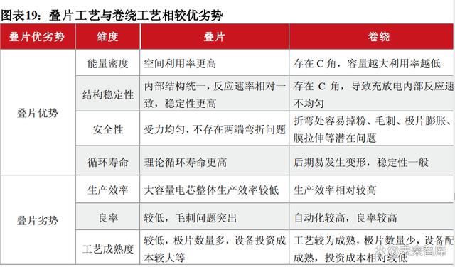 因此疊片工藝的電池理論上擁有更高體積能量密度上限、更穩(wěn)定的內(nèi)部結(jié)構(gòu)和更長(zhǎng)的循環(huán)次數(shù)。全模切極耳數(shù)量變?yōu)閮杀叮山鉀Q電子電導(dǎo)的集流問(wèn)題,提升電池快充性能。此外,疊片技術(shù)還可減少Pack零部件數(shù)量,提升電池集成度,有利于減少儲(chǔ)能系統(tǒng)占地面積和土建支出。