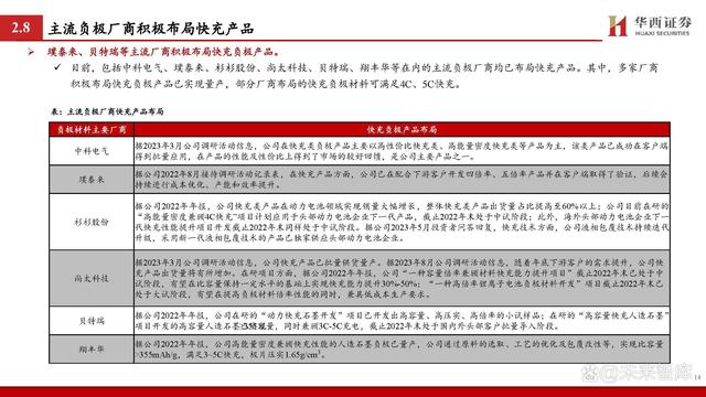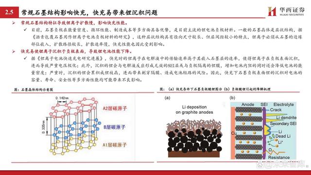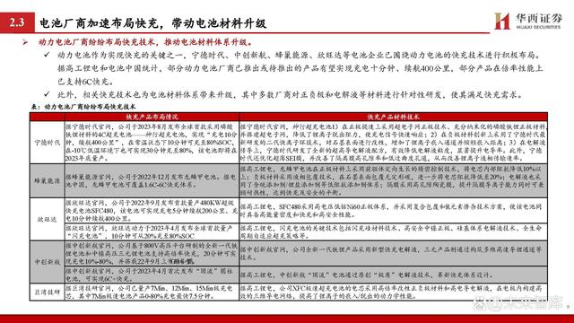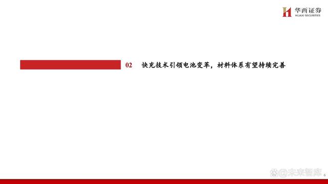 鋰離子傳輸是影響快充核心,重點聚焦負極和電解液等材料。據 《鋰離子電池快速充電研究進展》: 鋰電池也被稱為“搖椅”式電池,鋰離子傳輸是影響充電 過程的重要因素。在充電過程中,鋰離子的路徑大致為: 從正極材料中脫出,通過正極/電解質界面(CEI)進入電 解液,并以溶劑化的形式移動至負極,在去溶劑化后穿過 負極表面的固體/電解質界面(SEI)嵌入負極層狀結構中并 與電子結合。 對于電極材料而言,材料內部離子傳輸通道及材料顆粒的 形態、形狀和取向等是影響鋰離子的擴散的重要因素,其 中負極相較正極受影響更大。對于電解液而言,由于傳統 的電解液在氧化還原穩定性上具備劣勢,快充會使其不斷 分解并形成EEI層,導致鋰離子呈現較慢的傳輸動力學;同 時,傳統電解液的溶劑化結構去溶劑化勢壘較高,對鋰離 子的擴散形成阻礙。 因此,如何顯著提升鋰離子在負極、電解液等材料中的擴 散動力學成為當下研究的重點。