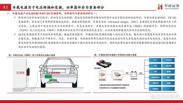車載電源產品包括OBC和DC-DC變換器等,功率器件為重要原材料之一。 除電動汽車的電驅系統外,承擔交直流電轉換、高低電壓轉換等功能的功率器件也是車載電源的組成部分。車載電源包括OBC、DC-DC 變換器等,是電動汽車架構的重要組成部分。據威邁斯招股書,車載充電機(On-board charger,OBC)是指固定安裝在新能源汽車上的 充電機,主要應用于交流電充電方式的場景中。在充電過程中,車載充電機依據電池管理系統(BMS)的控制信號,將單相交流電 (220V)或三相交流電(380V)轉換為動力電池可以使用的高壓直流電,從而實現對新能源汽車動力電池的充電。 DC/DC變換器則用于高低電壓的變換。據威邁斯招股書,車載DC/DC變換器的輸入端為動力電池,輸出端口連接整車低壓用電設備和低 壓蓄電池。新能源汽車中的車燈、儀表、電動車窗、電動座椅等常見低壓用電設備在運行時無法直接從高壓動力電池取電,需要從低壓 蓄電池取電或借助DC/DC變換器進行高低壓變換后才能從高壓動力電池取電,同時低壓蓄電池中儲存的能量同樣是通過DC/DC變換器從 高壓動力電池取電獲得。