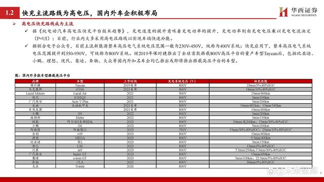 高電壓快充路線成為主流 。據《純電動汽車高電壓快充平臺技術趨勢》,充電速度的提升意味著充電功率的提升,充電功率則由充電電壓乘以充電電流決定 (P=UI);目前,行業內大多采用高電壓路線以實現車端快速補能。 據聯合電子公眾號,目前主流新能源整車高壓電氣系統電壓范圍一般為230V-450V,統稱為400V系統;快充應用下,整車高壓電氣系統 電壓范圍提升到550-930V,可統稱為800V系統。繼2019年保時捷推出了全球首款搭載800V高壓平臺的量產車型Taycan后,包括比亞迪、 小鵬、理想、現代、奧迪、奔馳、大眾等國內外知名車企均已推出或即將推出搭載高壓平臺的車型。
