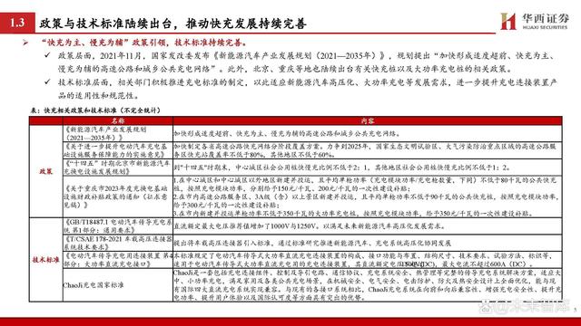 “快充為主、慢充為輔”政策引領,技術標準持續完善。 政策層面,2021年11月,國家發改委發布《新能源汽車產業發展規劃(2021—2035年)》,規劃提出“加快形成適度超前、快充為主、 慢充為輔的高速公路和城鄉公共充電網絡”。此外,北京、重慶等地也陸續出臺有關快充樁以及大功率充電樁的相關政策。 技術標準層面,相關部門積極推進充電標準的制定,以此適應新能源汽車高壓化、大功率充電等發展需求,進一步提升充電連接裝置產 品的適用性和規范性。