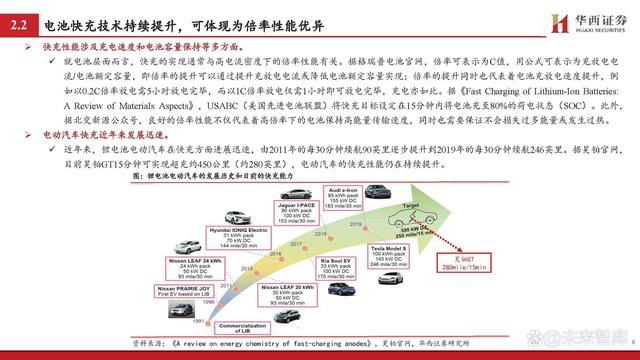 快充性能涉及充電速度和電池容量保持等多方面。 就電池層面而言,快充的實現通常與高電流密度下的倍率性能有關。據格瑞普電池官網,倍率可表示為C值,用公式可表示為充放電電 流/電池額定容量,即倍率的提升可以通過提升充放電電流或降低電池額定容量實現;倍率的提升同時也代表著電池充放電速度提升,例 如以0.2C倍率放電需5小時放電完畢,而以1C倍率放電僅需1小時即可放電完畢,充電亦如此。據《Fast Charging of Lithium-Ion Batteries: A Review of Materials Aspects》,USABC(美國先進電池聯盟)將快充目標設定在15分鐘內將電池充至80%的荷電狀態(SOC)。此外, 據北交新源公眾號,良好的倍率性能不僅代表著高倍率下的電池保持高能量傳輸速度,同時也需要保證不會損失過多能量或發生過熱。