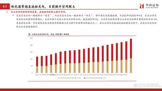 從公共充電樁的結構來看,直流樁仍有較大提升空間。 交流充電系統一般被稱為“慢充”,而直流充電系統一般被稱為“快充”。據中國充電聯盟數據,從2022年到2023年9月,直流公共充 電樁的占比整體保持穩定,且總體低于交流公共充電樁的占比;截至2023年9月,公共直流樁保有量占公共充電樁保有量的比例為43.1%。 考慮到充電難、充電慢依然是當前使用新能源汽車過程中需要解決的痛點之一,在之后的充電基礎設施的建設過程中,直流公共充電樁 的占比有望持續提升。