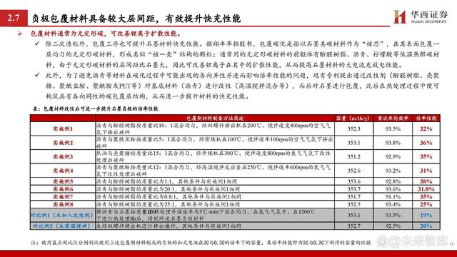 包覆材料通常為無定形碳,可改善鋰離子擴散性能。 除二次造粒外,包覆工序也可提升石墨材料快充性能。據翔豐華招股書,包覆碳化是指以石墨類碳材料作為“核芯”,在其表面包覆一 層均勻的無定形碳材料,形成類似“核-殼”結構的顆粒;通常用的無定形碳材料的前軀體有酚醛樹脂、瀝青、檸檬酸等低溫熱解碳材 料,由于無定形碳材料的層間距比石墨大,因此可改善鋰離子在其中的擴散性能,從而提高石墨材料的大電流充放電性能。 此外,為了避免瀝青等材料在碳化過程中可能出現的各向異性并進而影響倍率性能的問題,現有專利提出通過改性劑(酚醛樹脂、殼聚 糖、聚酰亞胺、聚酰胺或PET等)對基底材料(瀝青)進行改性(高溫攪拌混合等),而后對石墨進行包覆,此后在熱處理過程中便可 構筑具有各向同性的碳包覆層結構,從而進一步提升材料的快充性能。