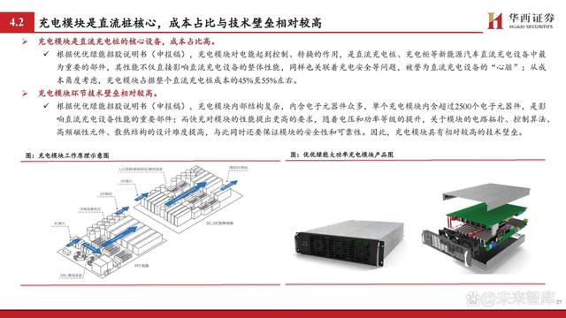 充電模塊是直流充電樁的核心設備,成本占比高。 根據優優綠能招股說明書(申報稿),充電模塊對電能起到控制、轉換的作用,是直流充電樁、充電柜等新能源汽車直流充電設備中最 為重要的部件,其性能不僅直接影響直流充電設備的整體性能,同樣也關聯著充電安全等問題,被譽為直流充電設備的“心臟”;從成 本角度考慮,充電模塊占據整個直流充電樁成本的45%至55%左右。