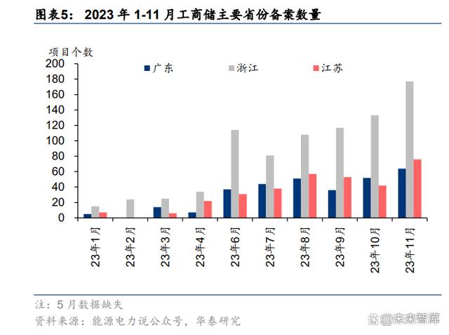 多因素推動,23 年高增趨勢初現。根據能源電力說公眾號的不完全統計,僅 2023 年 7-11 月,國內工商業儲能備案項目個數達 1305 個。從工商業分布較為集中的廣東、浙江、江蘇 三個省份來看,月度備案項目數量均呈現大幅上升趨勢。據不完全統計,2023 年以來我國 工商業儲能備案規模已經達到 3.46GW/9.26GWh。工商業儲能高速增長的勢頭已經初步顯 現,2023 年成為國內工商儲的放量元年。