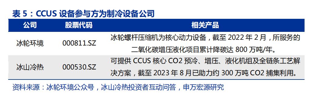 2)藍氫:在化石能源制氫基礎上增添碳捕集設備,至2025 年需增設年捕集量2000 萬噸的CCUS 設備,核心動力裝置為螺桿壓縮機,廠商主要包括冰輪環境、冰山冷熱;