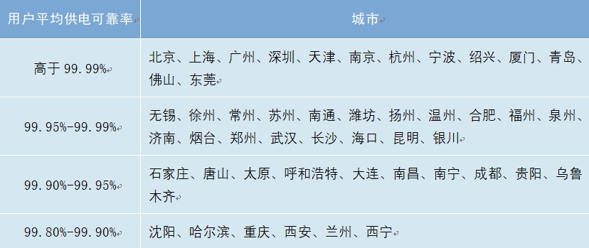 2023年,全國50個主要城市供電可靠性繼續保持較高水平,其中,北京、上海、廣州、深圳、天津、南京、杭州、寧波、紹興、廈門、青島、佛山、東莞用戶平均供電可靠率高于99.99%;長春、拉薩用戶平均供電可靠率低于99.90%。
