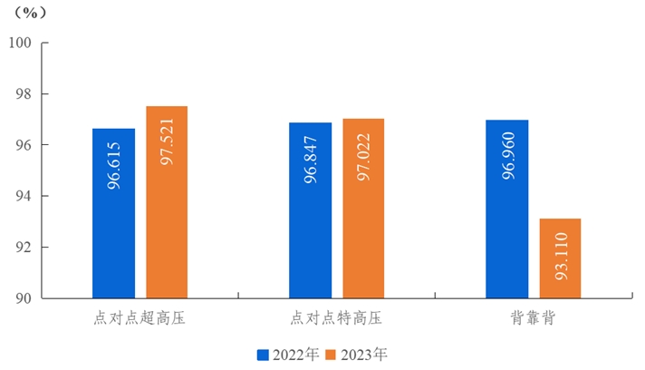2023年,納入電力可靠性統計的點對點超高壓直流輸電系統能量可用率為97.521%,同比上升0.906個百分點;點對點特高壓直流輸電系統能量可用率為97.022%,同比上升0.175個百分點;背靠背直流輸電系統能量可用率為93.110%,同比下降3.850個百分點。