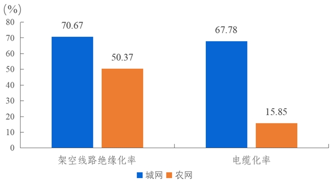 2023年,納入電力可靠性統計的10千伏等效總用戶數為1289.04萬戶,用戶總容量55.70億千伏安。城網架空線路絕緣化率、電纜化率分別為70.67%、67.78%,農網架空線路絕緣化率、電纜化率分別為50.37%、15.85%。