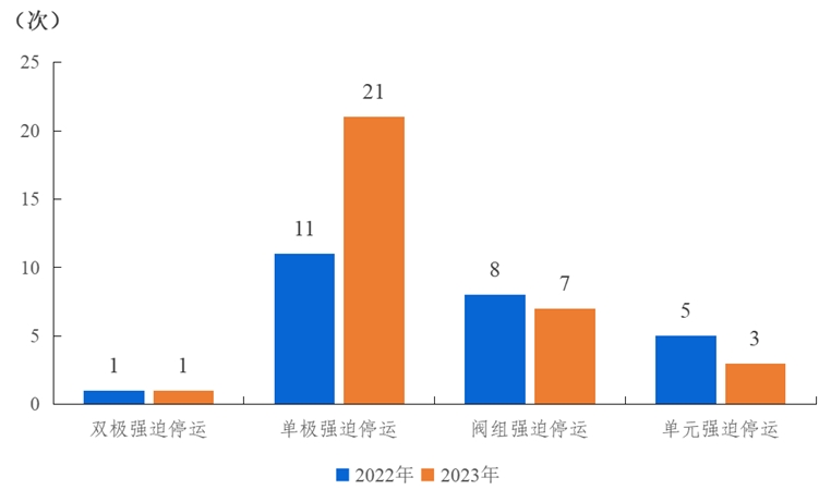 2023年,納入電力可靠性統計的直流輸電系統發生32次強迫停運,其中雙極強迫停運1次,與上一年持平;單極強迫停運21次,同比增加10次;閥組強迫停運7次,同比減少1次;單元強迫停運3次,同比減少2次。各系統強迫停運的等效停運小時累計值為383.35小時。