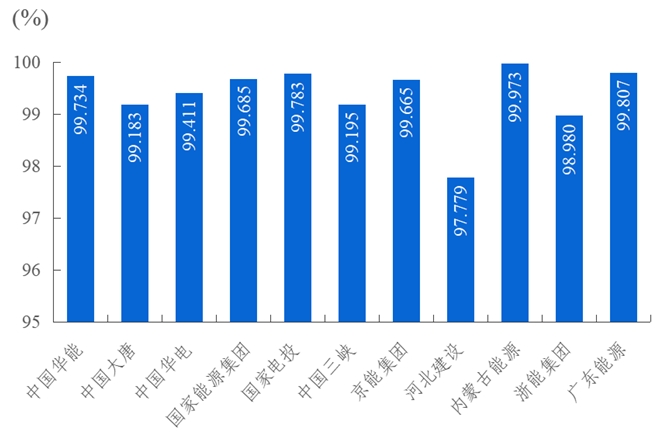 2023年,發電側11家集團公司變壓器可用系數前三位分別是廣東省能源集團有限公司99.747%、內蒙古能源集團有限公司99.576%、國家能源投資集團有限責任公司99.097%。
