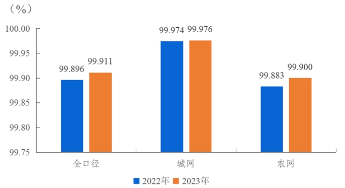 2023年,全國用戶平均供電可靠率99.911%,同比上升0.015個百分點,其中,城網99.976%,農網99.900%。城網與農網相差0.076個百分點。
