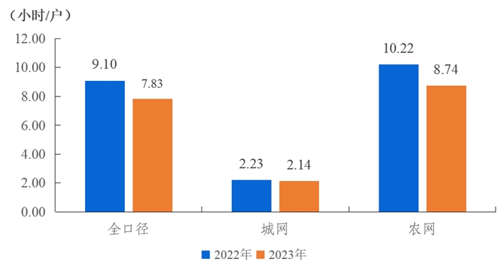 全國用戶平均停電時間7.83小時/戶,同比減少1.27小時/戶,其中城網2.14小時/戶,農網8.74小時/戶。城網與農網相差6.60小時/戶。