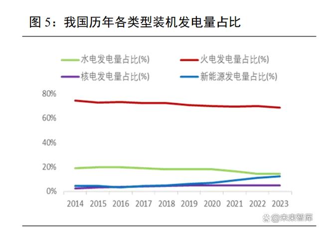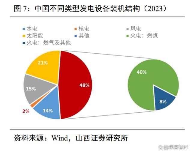 目前我國(guó)電力發(fā)電結(jié)構(gòu)仍以火電為絕對(duì)主力。截止 2023 年底,我國(guó)電力總裝機(jī)29.2億千瓦,火電、水電、核電、風(fēng)電及太陽(yáng)能分別占比 47.62%、14.44%、1.95%、15.12%和20.88%;其中,燃煤火電占比 39.9%,風(fēng)能和太陽(yáng)能合計(jì)占比 36%。從發(fā)電結(jié)構(gòu)來(lái)看,2023年我國(guó)規(guī)上發(fā)電設(shè)備總發(fā)電量 8.91 萬(wàn)億千瓦時(shí),火、水、核、風(fēng)、太陽(yáng)能分別占比69.95%、12.81%、4.86%、9.08%、3.30%。
