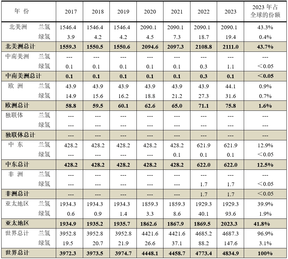 縱觀全球2023年氫氣生產仍然以從化石燃料制氫“蘭氫”為主,占96.9%,而從再生能源制氫“綠氫”為輔,僅占3.1%,再生能源制氫是發展方向,但中南美洲、獨聯體、非洲等地區的蘭氫沒有行動;獨聯體、中東和非洲的“綠氫”也沒有行動。