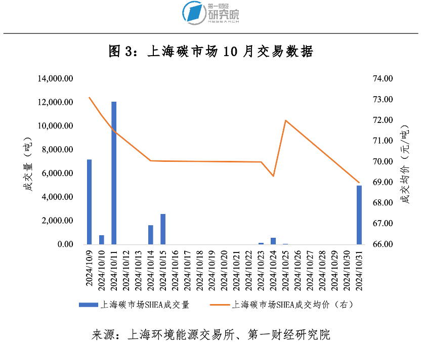 10月上海碳市場碳排放配額(SHEA)成交量3.01萬噸,成交額214.68萬元,成交均價71.23元/噸。10月最后一個交易日成交均價69.00元/噸,較9月最后一個交易日成交均價75.00元/噸下跌8%。截至10月31日,SHEA累計成交量5479.62萬噸(掛牌交易2431.40萬噸,協議轉讓3048.22萬噸),累計成交額17.02億元。