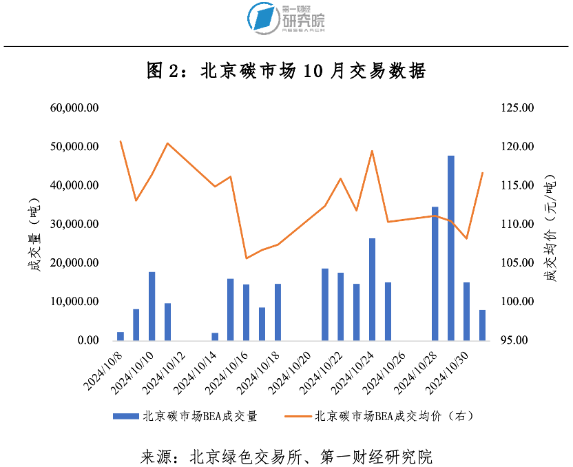 10月北京碳市場碳排放配額(BEA)成交量29.30萬噸,成交額3300.75萬元,成交均價112.67元/噸。10月最后一個交易日成交均價116.73元/噸,較9月最后一個交易日成交均價111.47元/噸上漲4.72%。截至10月31日,BEA累計成交量5704.22萬噸(公開交易2036.05萬噸,協議轉讓3668.17萬噸),累計成交額30.42億元。