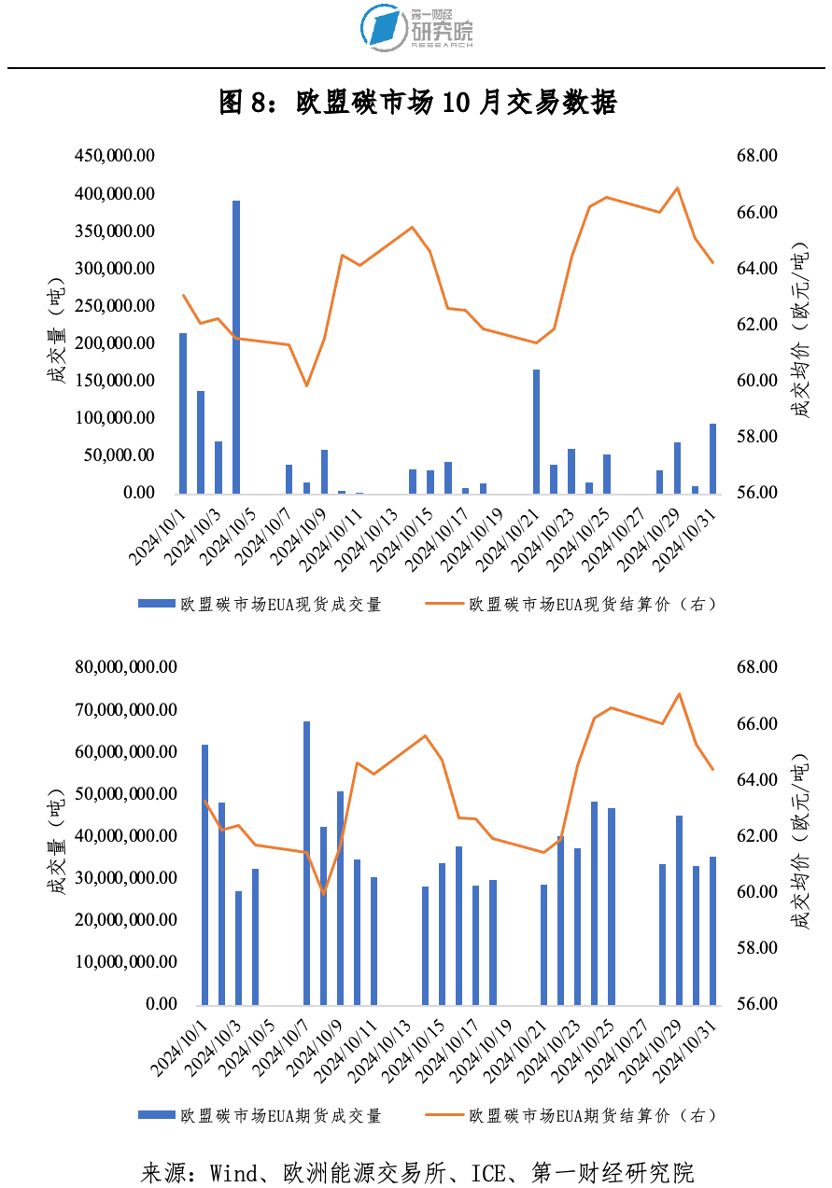 10月歐盟碳排放配額(EUA)現貨成交量161.50萬噸,期貨成交量9.04億噸。10月EUA現貨結算價最低59.87歐元/噸,最高66.93歐元/噸;期貨結算價最低59.98歐元/噸,最高67.13歐元/噸。