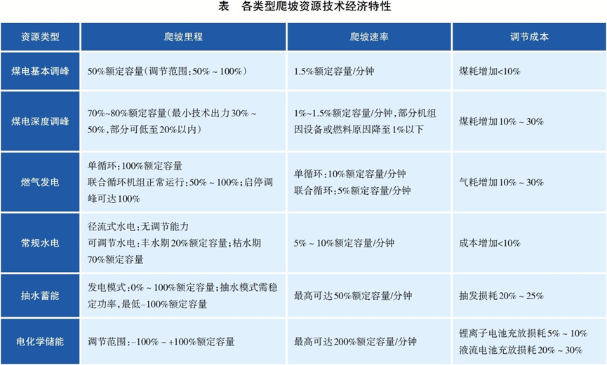 系統爬坡能力需基于各類型爬坡資源技術經濟特性開展分析。從爬坡速率和里程等調節性能看,電化學儲能和抽水蓄能普遍優于煤電、氣電等火電電源,可調節水電枯水期的調節能力優于豐水期;從調節成本看,煤電基本調峰和常規水電調節成本較低,氣電調峰次之,抽水蓄能與電化學儲能的成本取決于抽發電價差與轉換效率,煤電深度調峰成本較高。
